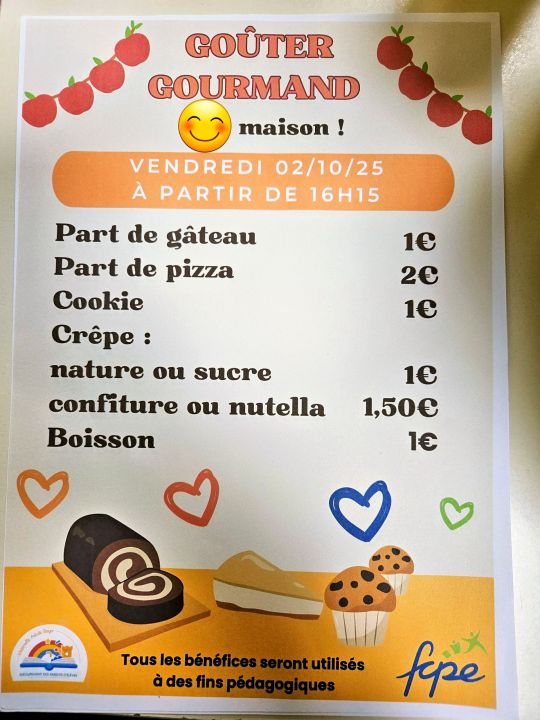 Le premier goûter gourmand aura lieu vendredi 3 octobre à 16h30. Venez vous régaler.